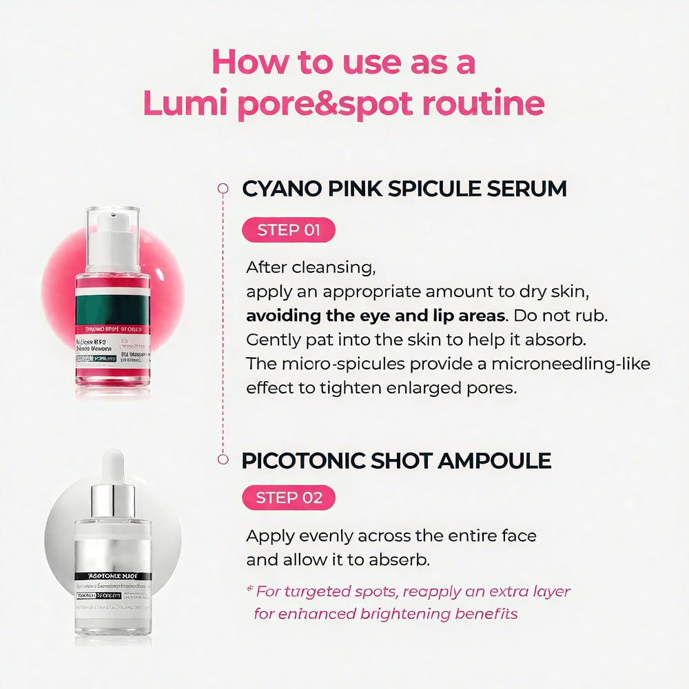 • Phase 1: Cyano Pink Spicule Serum - Boosts collagen and tightens enlarged pores.