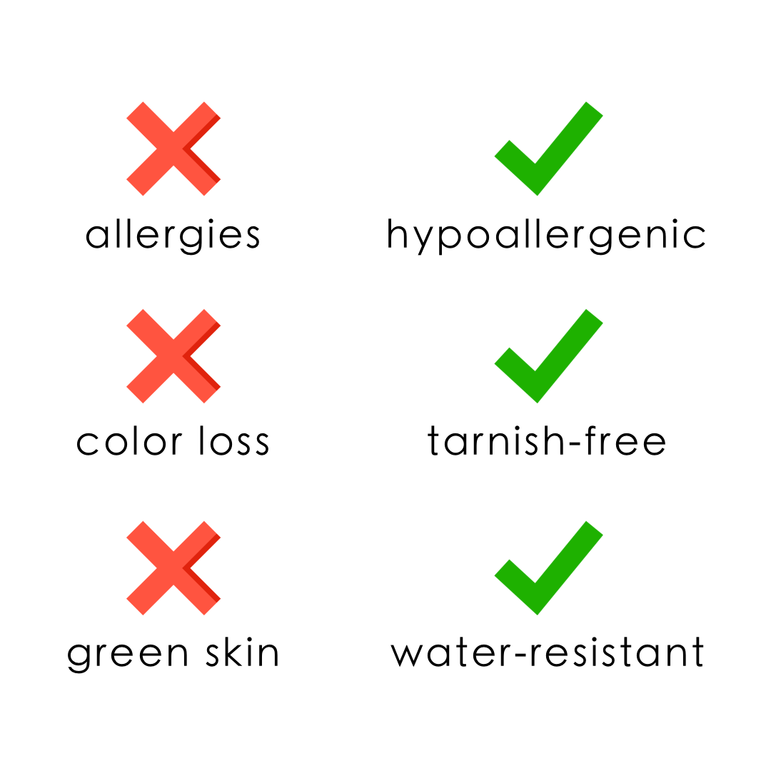 This system creates a completely waterproof, sweat-proof, and fade-resistant finish that will not tarnish or turn your skin green, guaranteed. It gives you the freedom to enjoy effortless, everyday elegance without the worry.