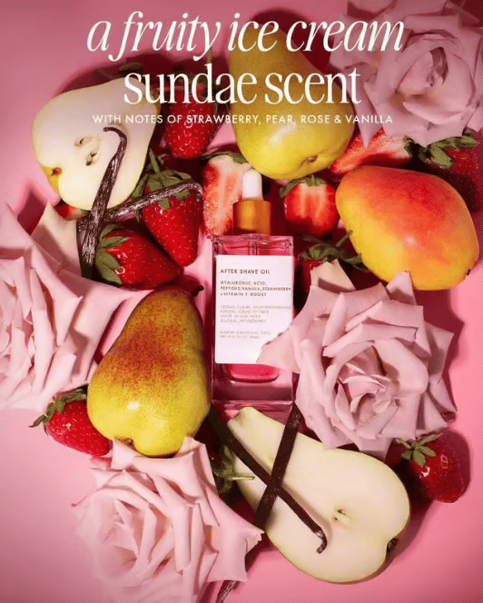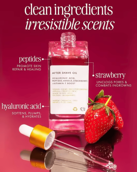 INSTANTLY CALM SHAVING & WAXING IRRITATION Infused with strawberry extract and soothing agents, the oil instantly calms the post-shave inflammation that causes redness, burning, and razor bumps, leaving your skin feeling comfortable and refreshed.