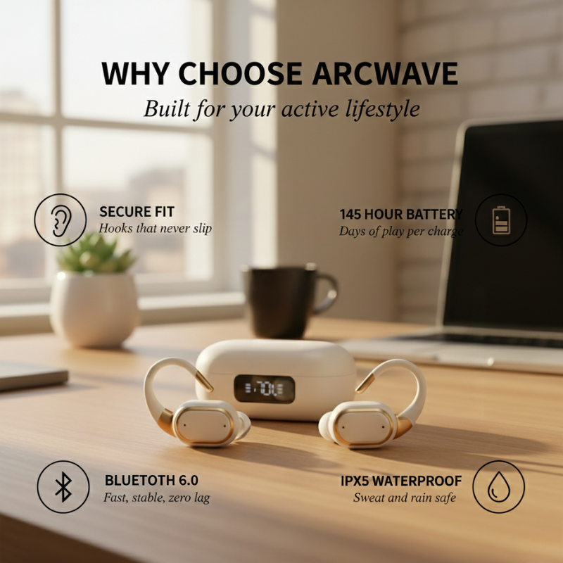 Arcwave™ – Open-Ear Hook Wireless Earbuds | 145Hr Battery, Waterproof, Bluetooth 6.0 + 50% OFF