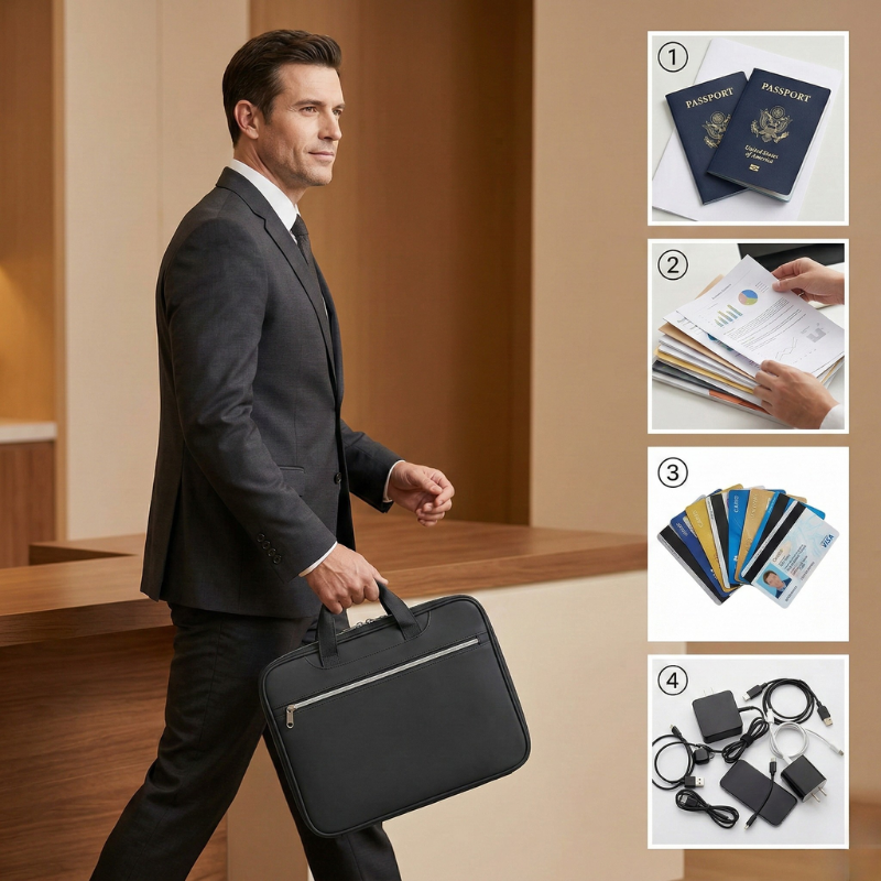 How many documents and pockets does it hold? Bastion™ features multiple expandable accordion compartments that fit US Letter (8.5×11"), A4, and smaller documents, plus internal card slots and zippered pockets for passports, business cards, receipts, and small electronics. It's designed to hold your most important documents in one organized, portable case.