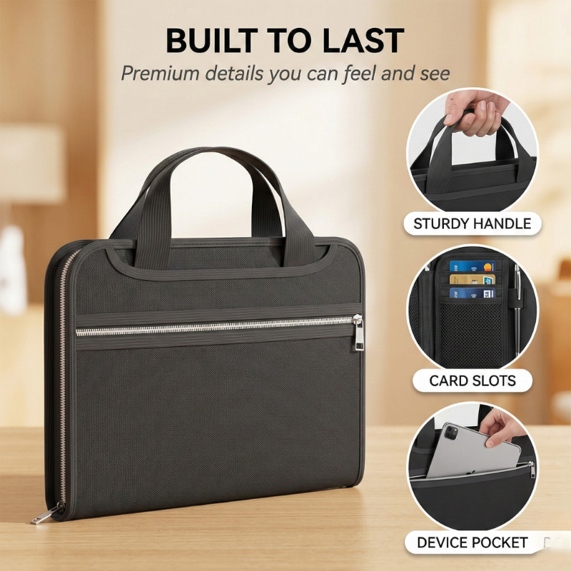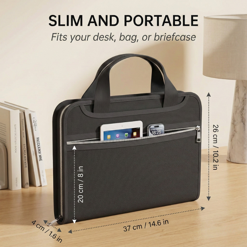 ✔ GRAB ONE CASE AND GO — YOUR ENTIRE FILE SYSTEM TRAVELS WITH YOU - A built-in sturdy handle, smooth heavy-duty zipper, and slim 14.6" × 10.2" profile mean Bastion™ fits in your briefcase, backpack, or desk drawer — and comes with you to meetings, tax appointments, or out the door in an emergency.