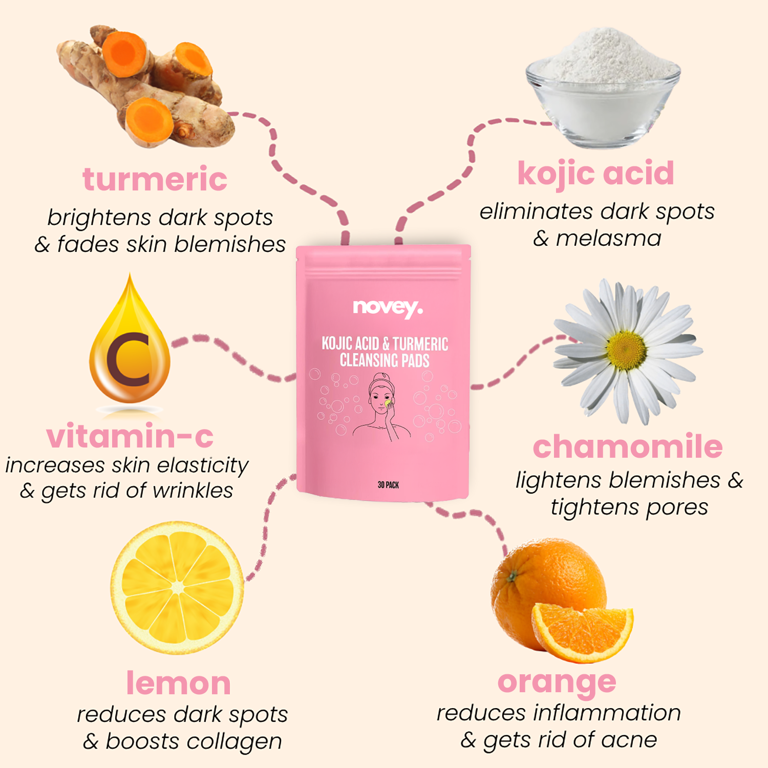 • Active Ingredients: Kojic Acid, Turmeric, Vitamin C, Chamomile