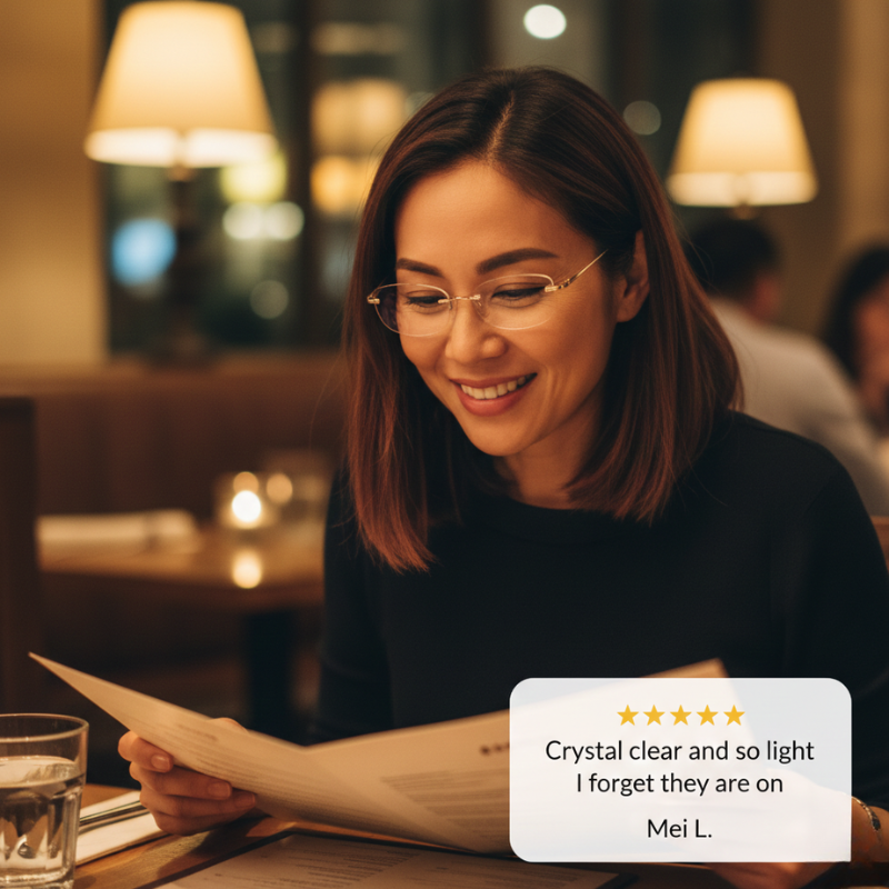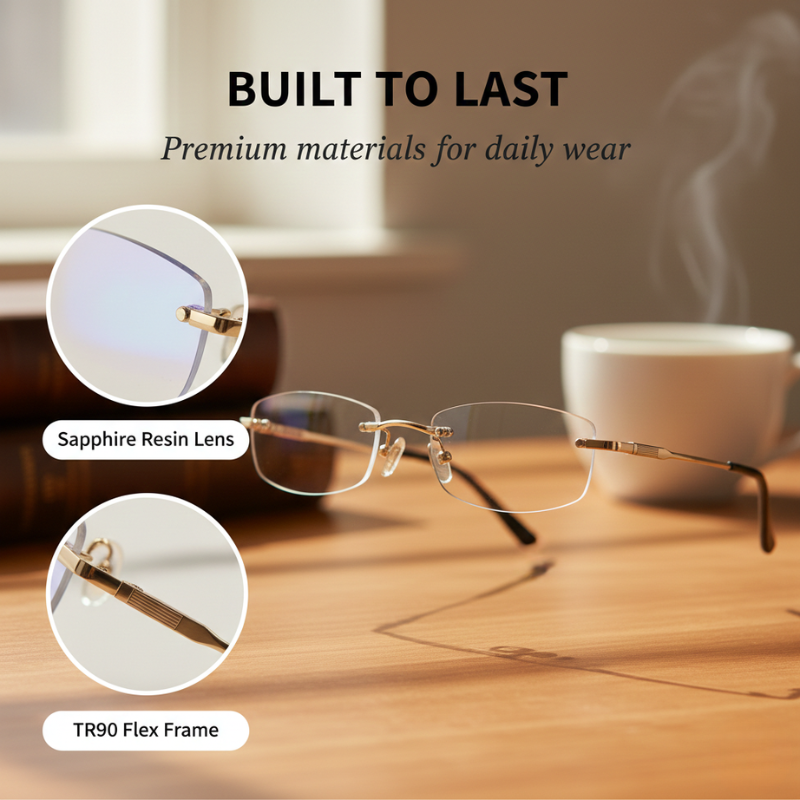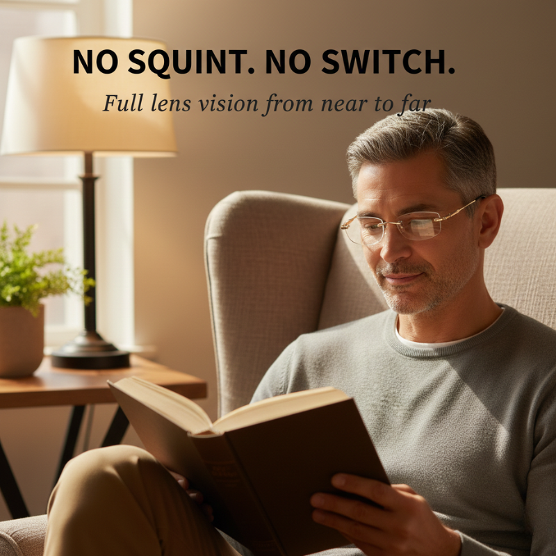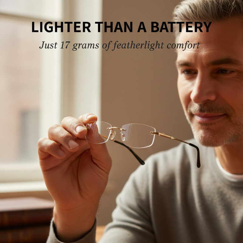 One pair. Every distance. No switching, no squinting, no compromise. The secret is a full-lens progressive multifocal zone paired with diamond-cut rimless edges and sapphire-hardness scratch coating — so you get razor-sharp clarity at every distance, wrapped in a frame so light (just 17 grams) you'll forget it's there.