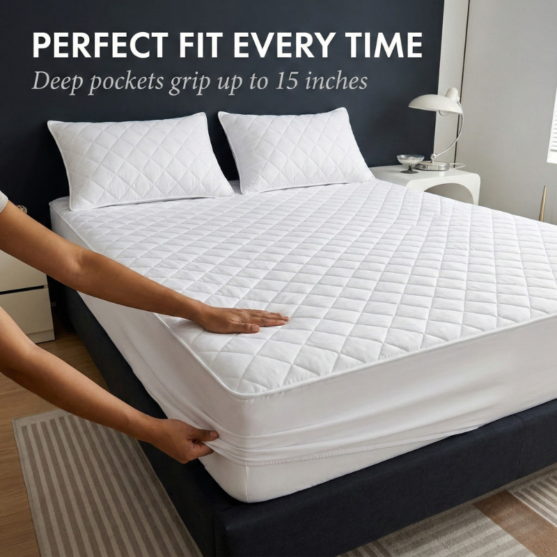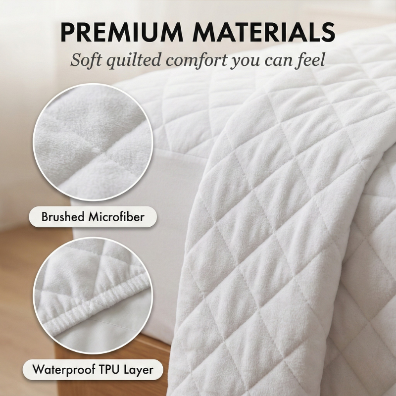 Material: Soft brushed microfiber quilted top with waterproof TPU backing — hypoallergenic, resistant to dust mites, mold, and mildew
