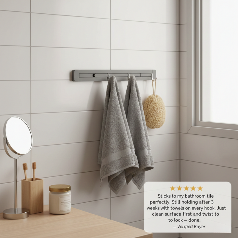 • How much weight can it hold? When properly installed on a clean, smooth surface, Gripova™ holds everyday items like towels, coats, bags, keys, umbrellas, and jewellery with ease. For heavier items, place them on the hooks closest to the suction cups (the ends) for maximum support.