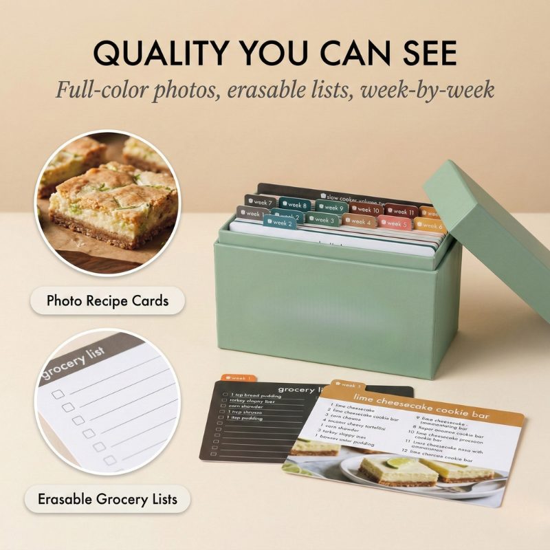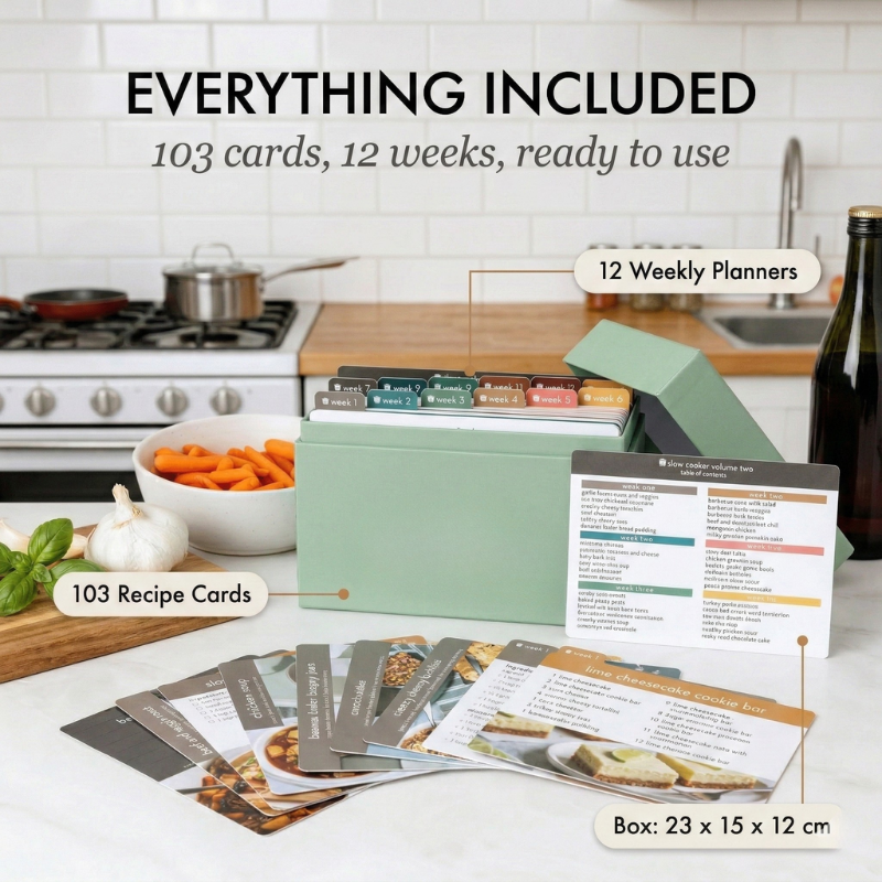 • What kind of recipes are included — will my family actually eat them? The Hearthwell™ kit includes 103 full-color slow cooker recipes across 12 weeks — covering crowd-pleasing family meals like roasts, pasta dishes, soups, casseroles, and even desserts. Every card has a photo of the finished dish so you can see exactly what you're making before you commit to it. Plus, the 5 blank cards let you swap in your own family favorites.