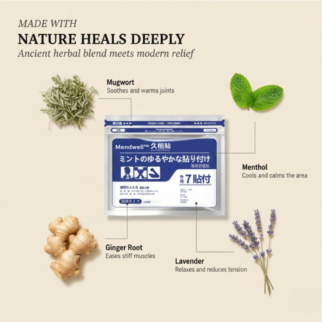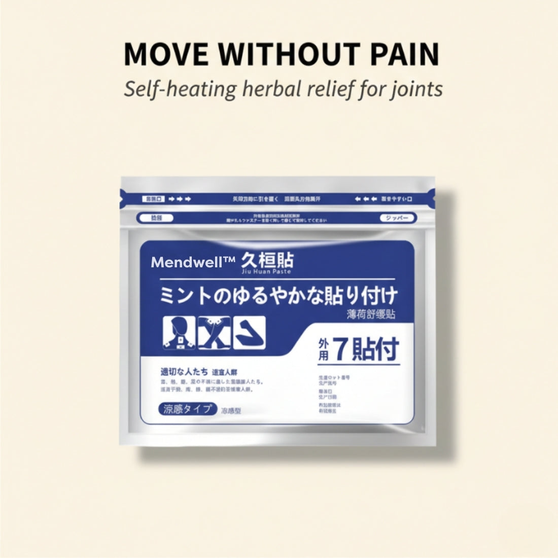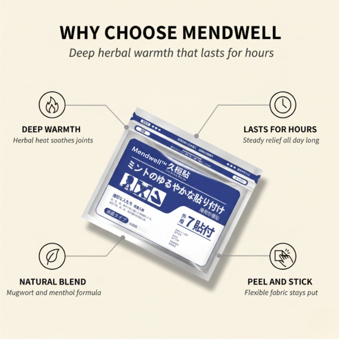Mendwell™ Herbal Pain Relief Patches use a centuries-old mugwort moxibustion blend that self-heats on contact with your skin — delivering deep, penetrating warmth directly into sore muscles and stiff joints for hours.