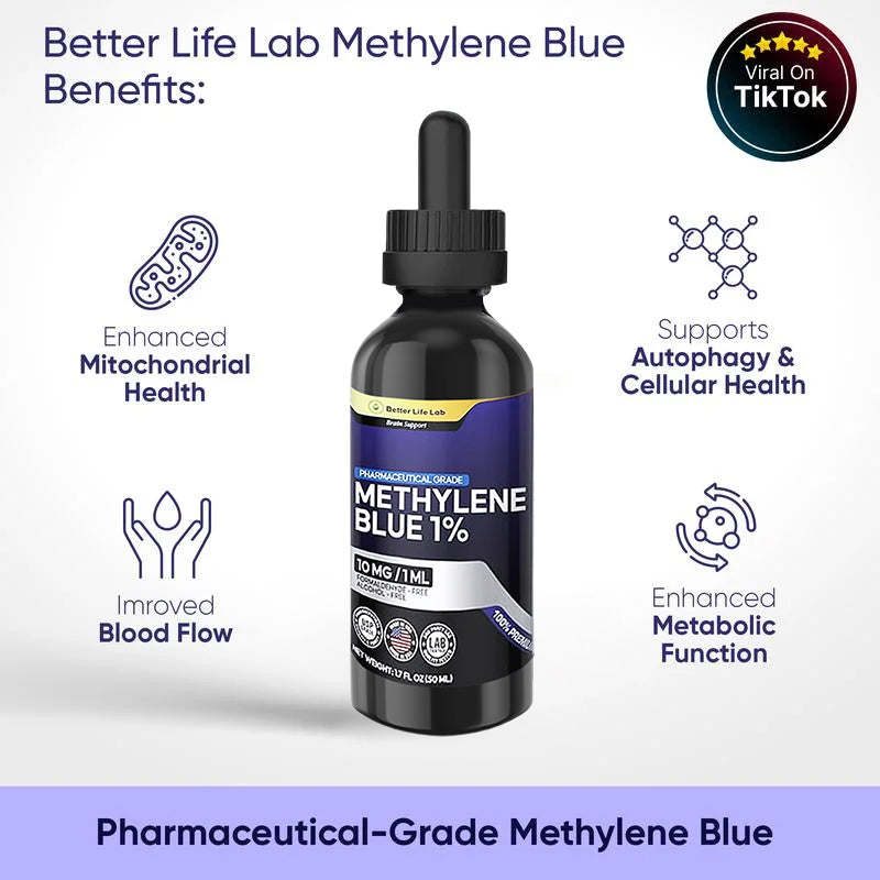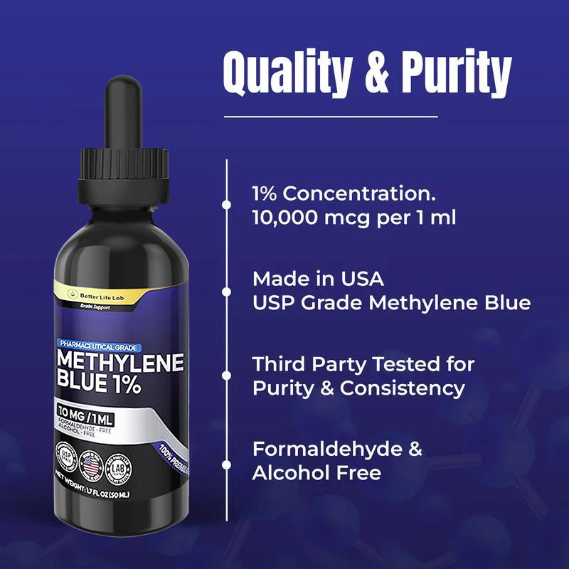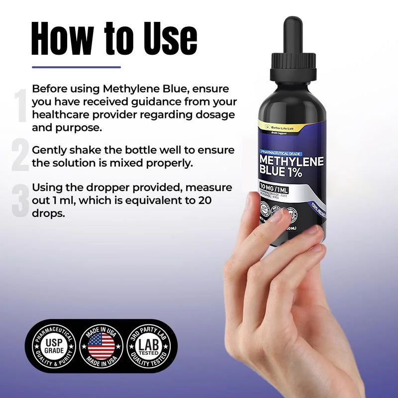 Add 3 to 5 drops to your morning drink, depending on your body weight. You can gradually increase the amount until you notice the desired effect. Do not use methylene blue if you are taking psychiatric medications, especially antidepressants such as SSRIs, SNRIs, MAOIs, or antipsychotics, as this combination can cause serious side effects including serotonin syndrome