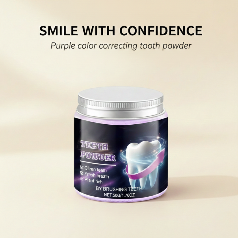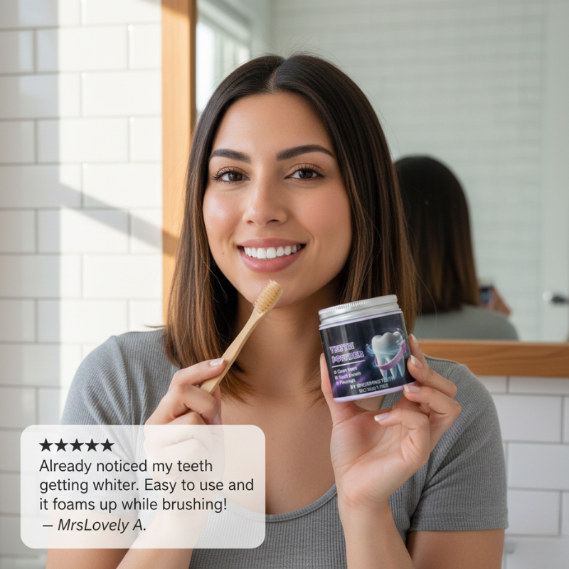 Will the purple powder stain my teeth, toothbrush, or sink? No — the purple pigment is designed to neutralize yellow tones, not deposit color. It rinses away completely, leaving only a brighter appearance behind. Your toothbrush and sink stay clean.