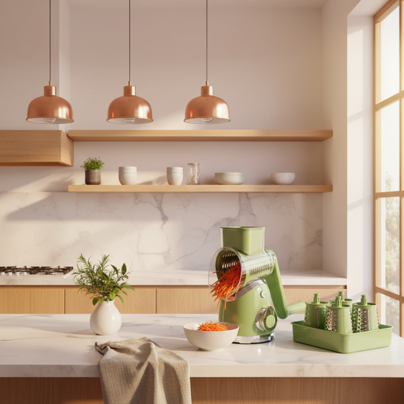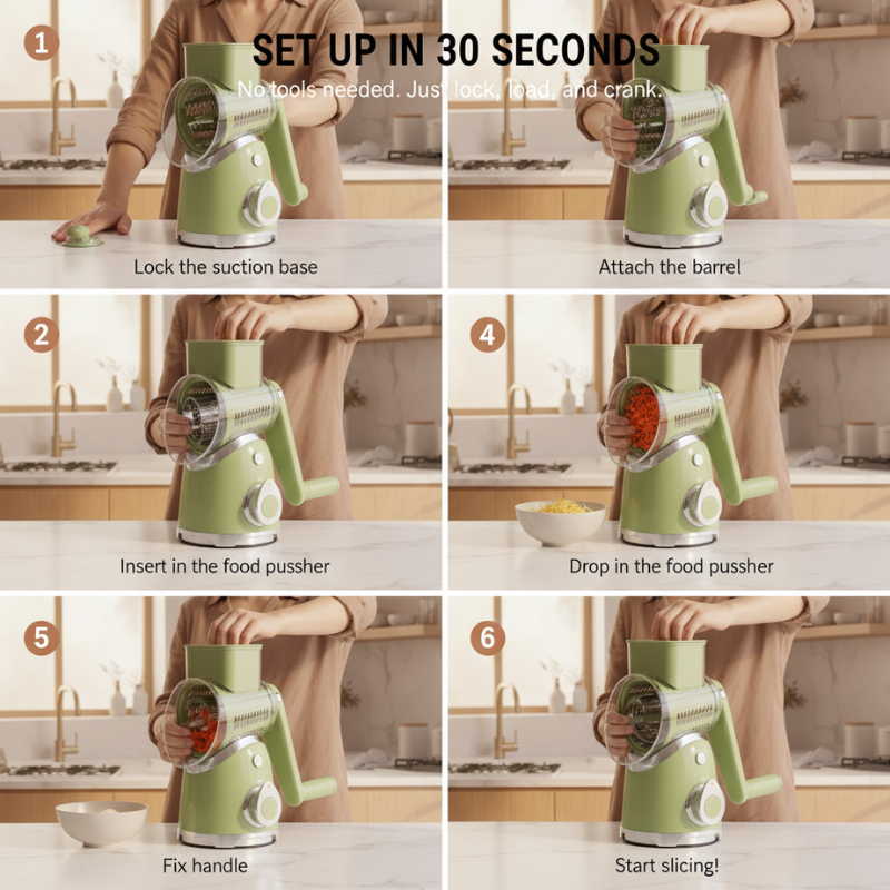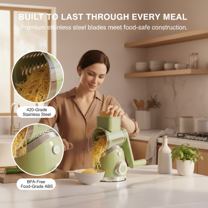 ✔ 5 interchangeable drum blades — fine shred, coarse shred, slice, waffle cut, and julienne. One tool replaces five. Swap blades in seconds without touching a sharp edge.