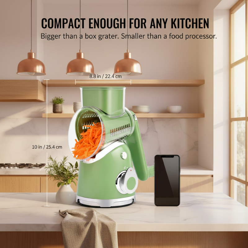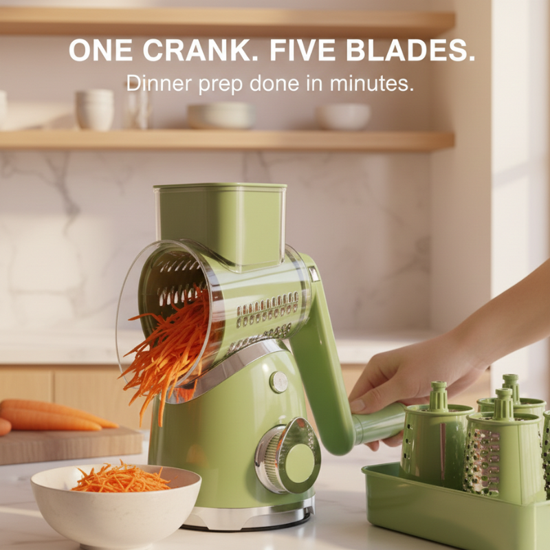 It's a weeknight. You're staring at an onion, a block of cheddar, and three carrots — knowing they all need to be prepped before anything else can happen. The grating. The uneven slices. The cheese stuck to your knuckles from that old box grater.
