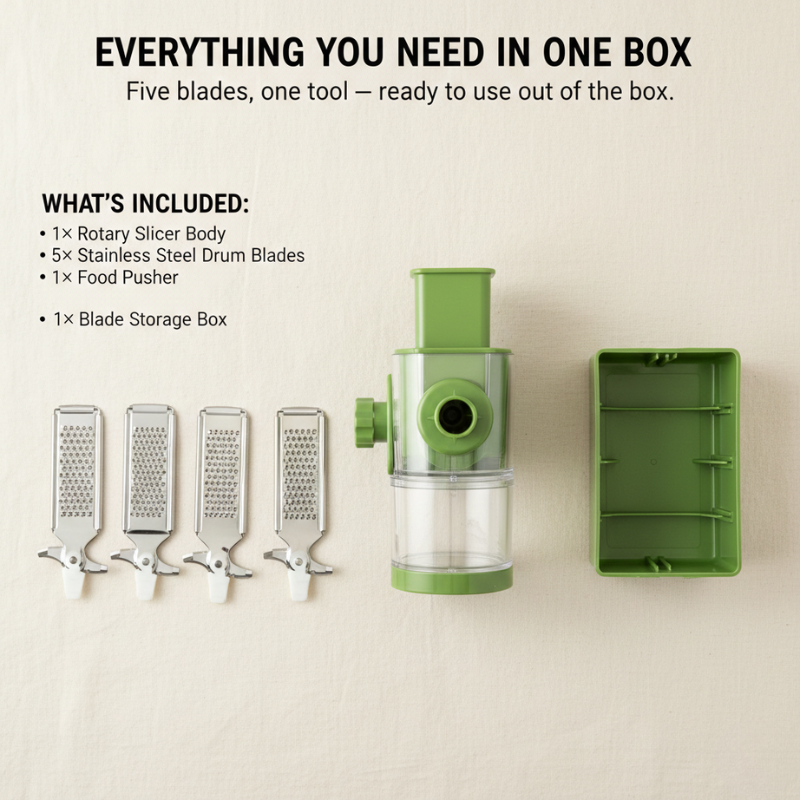 • What's IncludedRotary body, 5 drum blades, food pusher, blade storage box