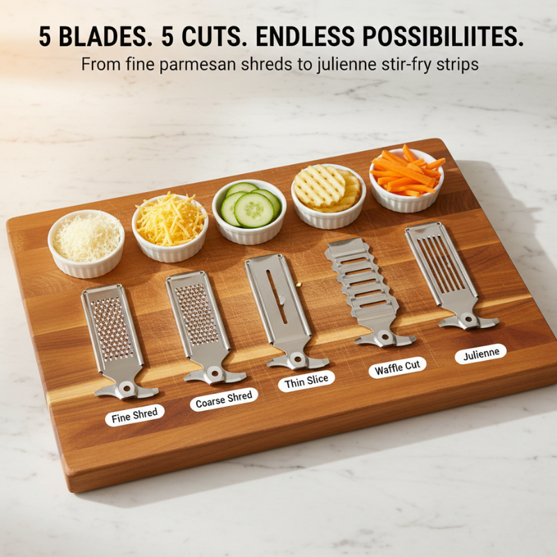• What are the 5 blade types and what do they cut? The QuickSlice comes with 5 stainless steel drum blades: Fine Shred (parmesan, chocolate, garlic), Coarse Shred (cheddar, mozzarella, hash browns), Thin Slice (cucumbers, potatoes, zucchini), Waffle Cut (decorative chips, garnishes), and Julienne (carrots, beets, stir-fry strips). All blades store neatly in the included storage box.