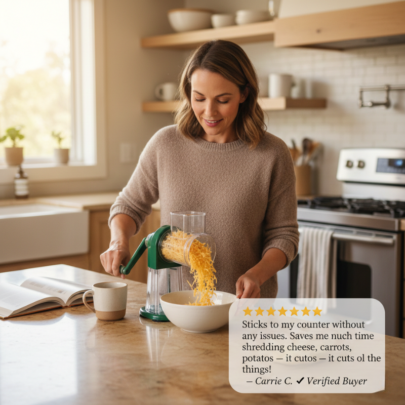 ✔ Suction-lock base grips smooth countertops — so you can crank with one hand while the other stays free. No sliding. No wobbling. No chasing the grater across the counter.