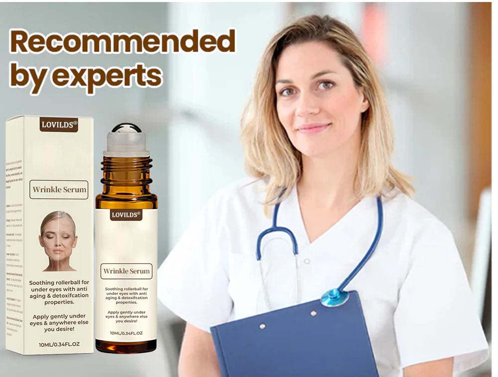 The mechanism is the LOVILDS 10S Wrinkle Serum, featuring an integrated rollerball designed for precision application and enhanced absorption.