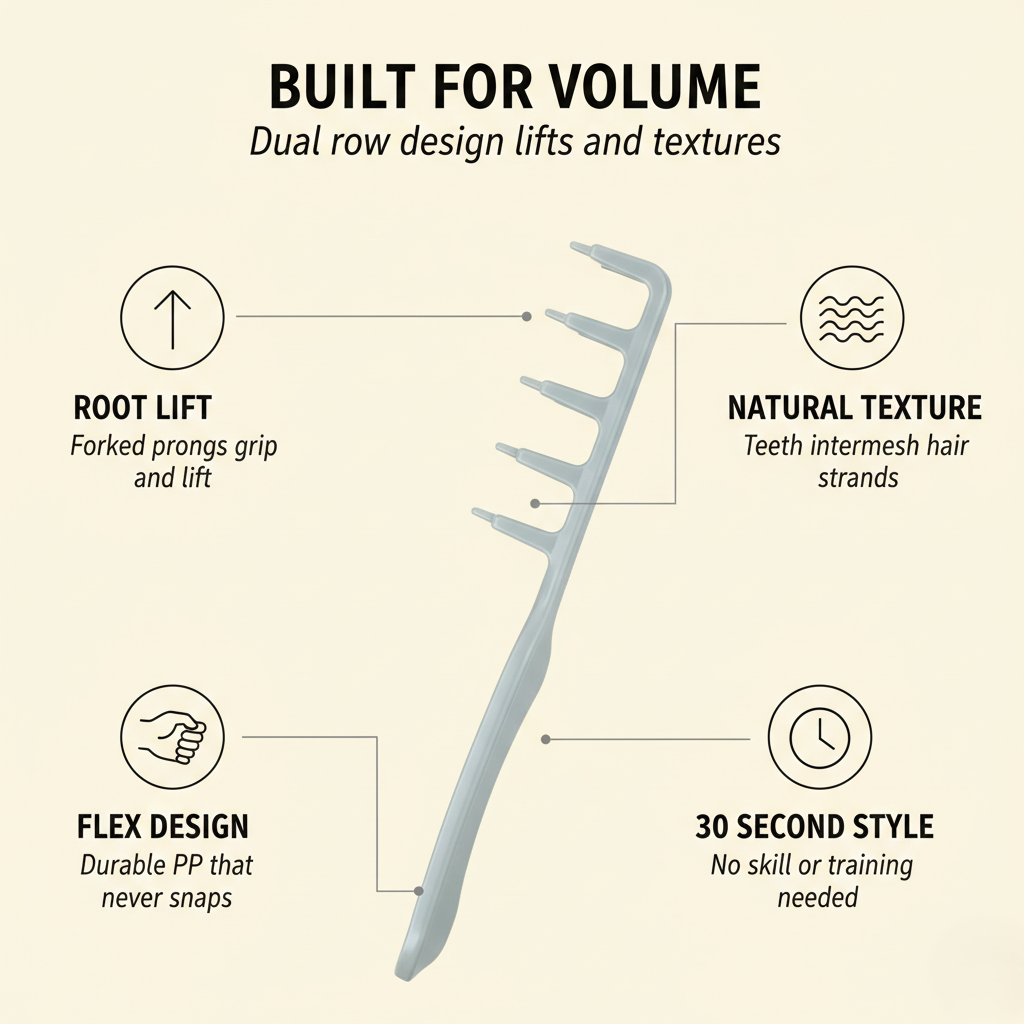 Each forked prong lifts and intermeshes your hair strands at the root, creating natural structural support that holds volume without product buildup or blow-dry skill.