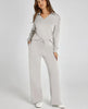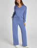 The mechanism is a perfectly coordinated set, featuring a chic v-neck collared long sleeve top and matching drawstring wide-leg pants, all crafted from a premium, soft, and breathable fabric.