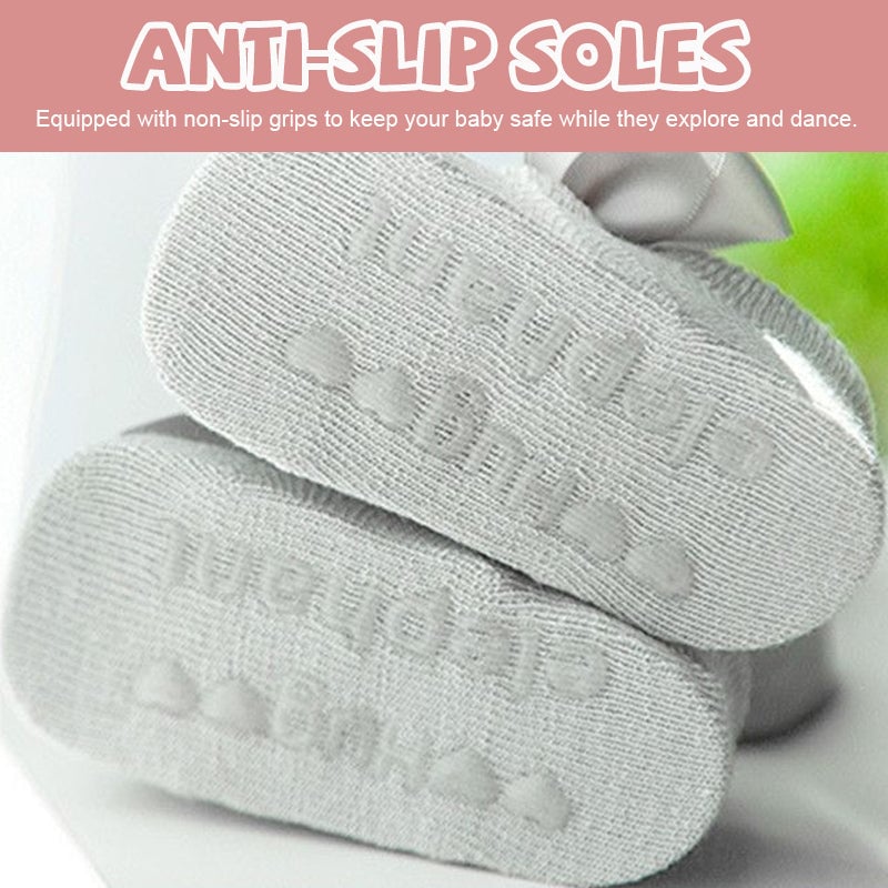 This system uses dozens of soft silicone grips to provide a stable, non-slip foundation on any surface, while the beautiful satin ribbon design creates a picture-perfect look. It gives you the peace of mind that your little one is safe, and the joy of seeing them in the most adorable socks imaginable.